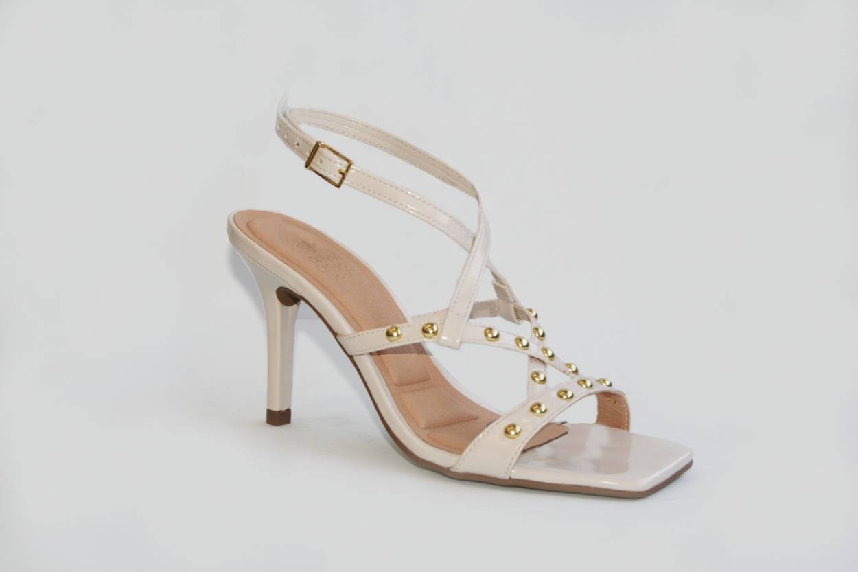 A Sandália Olivia Chaves une modernidade e elegância em um design marcante. Produzida em verniz bege, apresenta tiras delicadas cruzadas, adornadas com tachas douradas que dão um toque sofisticado e fashionista ao visual. O salto fino alonga a silhueta e garante uma postura elegante, enquanto a tira ajustável no tornozelo oferece segurança e conforto ao caminhar.